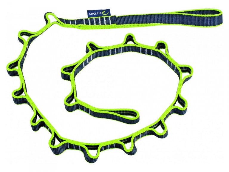 Mit der Daisy Chain Stufenschlinge von Edelrid lässt sich Material sortiert an einem 120 cm langem Tape aufbewahren.