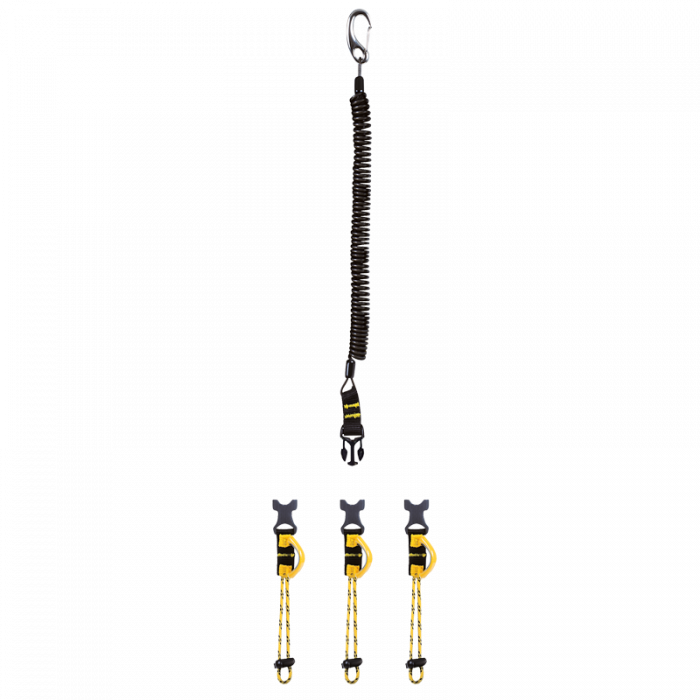 Mittels Ankerstich oder Kordelzug wird das Werkzeug befestigt - alle Werkzeuge, die mit der abnehmbaren Befestigungsschlaufe ausgestattet sind, können an der Spiralleine befestigt werden.
